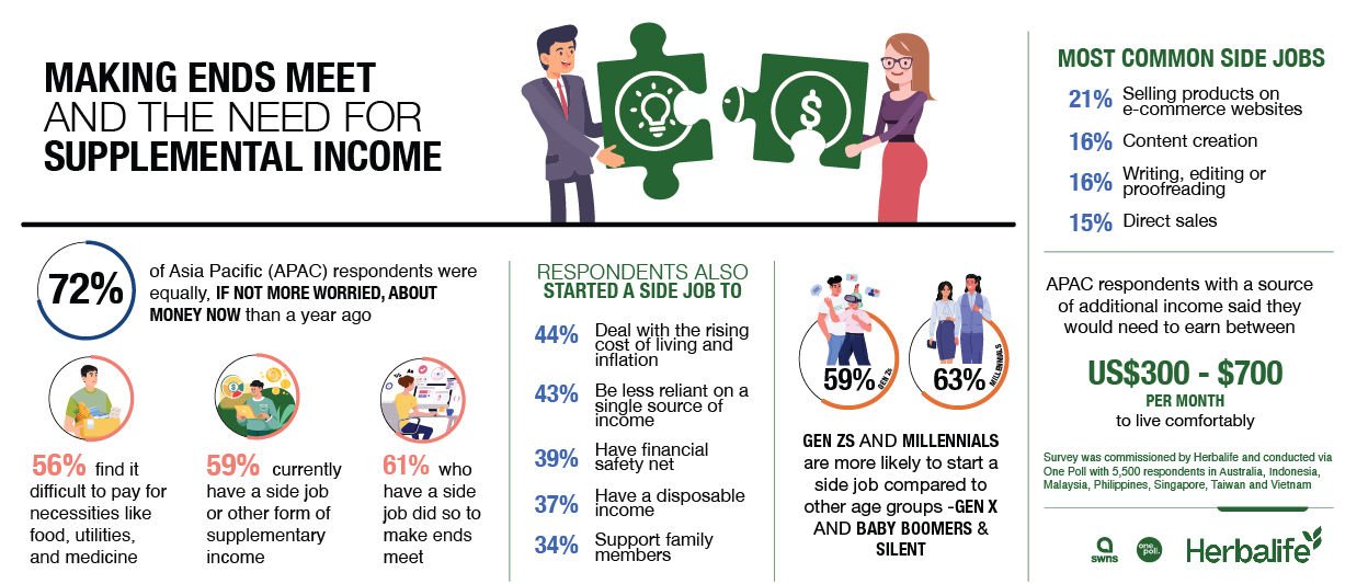 Herbalife, a global health and wellness company and community, released the findings of its 2023 Asia Pacific Side Job Survey, showed that the almost 3 in 5 (59%) respondents have a side job, and the top reason for doing so is to make ends meet (61%). Other reasons for starting a side job included dealing with the rising cost of living (44%) and being less reliant on a single source of income (43%).