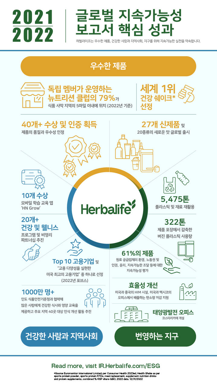 이번에 발간된 보고서는 지속가능성에 초점을 맞춰 2021년부터 2022년까지 ‘제품’, ‘사람과 지역사회’, ‘지구’를 중심으로 허벌라이프 글로벌 지사 전체에서 진행한 성과들을 소개했다.