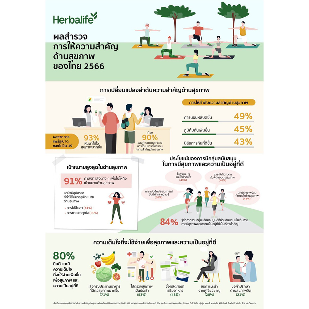 จากการสำรวจลำดับความสำคัญด้านสุขภาพของเฮอร์บาไลฟ์ที่จัดทำขึ้นในเดือนเมษายน 2566 โดยสำรวจผู้บริโภคจำนวน 5,504 คน ที่มีอายุระหว่าง 18 ถึง 78 ปี ในตลาดเอเชียแปซิฟิก 11 แห่ง ได้แก่ ออสเตรเลีย ฮ่องกง อินโดนีเซีย ญี่ปุ่น เกาหลี มาเลเซีย ฟิลิปปินส์ สิงคโปร์ ไต้หวัน ไทย และเวียดนาม พบว่าผู้บริโภคในประเทศไทยใส่ใจสุขภาพมากขึ้น จึงไม่น่าแปลกใจที่ผู้บริโภคจำนวนมากกว่า 80% ยินดีและมีความเต็มใจที่จะใช้จ่ายเพิ่มขึ้นเพื่อสุขภาพและความเป็นอยู่ที่ดี ซึ่งมีค่าเฉลี่ยดังนี้