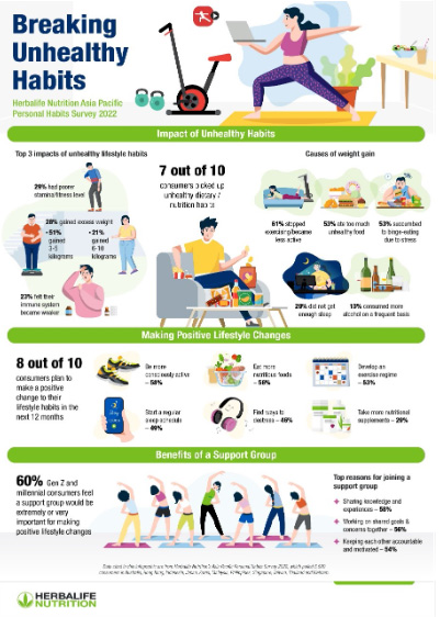 康寶萊於2022年8月進行了《亞太區個人健康習慣調查》,對澳洲、香港、印尼、日本、韓國、馬來西亞、菲律賓、新加坡、台灣、泰國和越南的5,500名18歲及以上消費者進行了調查,希望揭示自新冠疫情以來,該地區消費者的生活模式及行為的改變,以及他們計劃在未來12個月內改掉的不健康習慣。