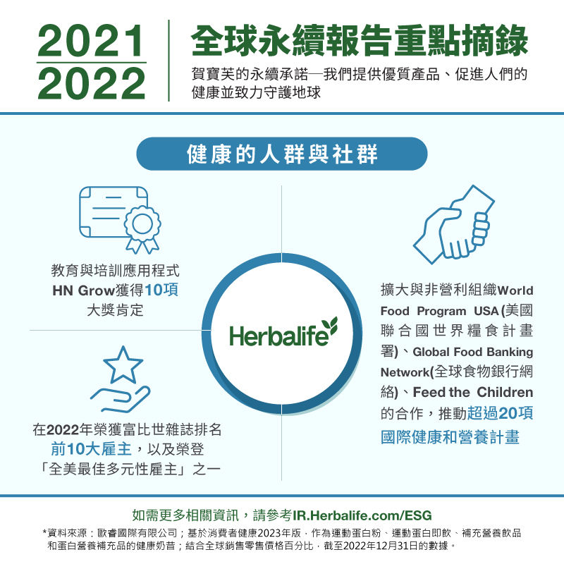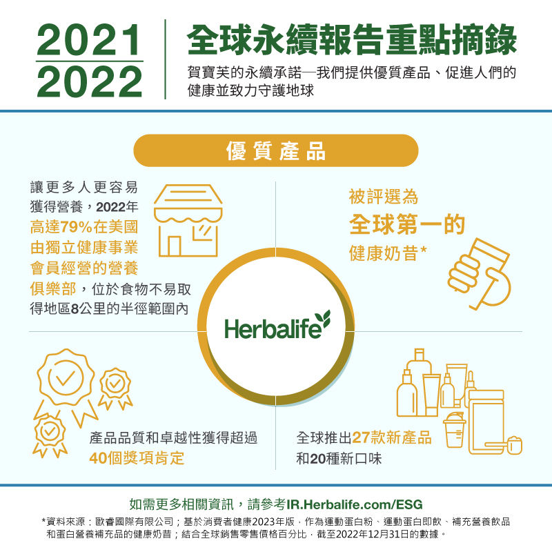 - 2022年,在美國由賀寶芙健康事業會員經營的12,000家營養俱樂部當中,有79%位於取得生鮮食品不易之食物沙漠(food desert)地區8公里的半徑範圍內,為當地居民提供經濟實惠、營養豐富的賀寶芙產品。