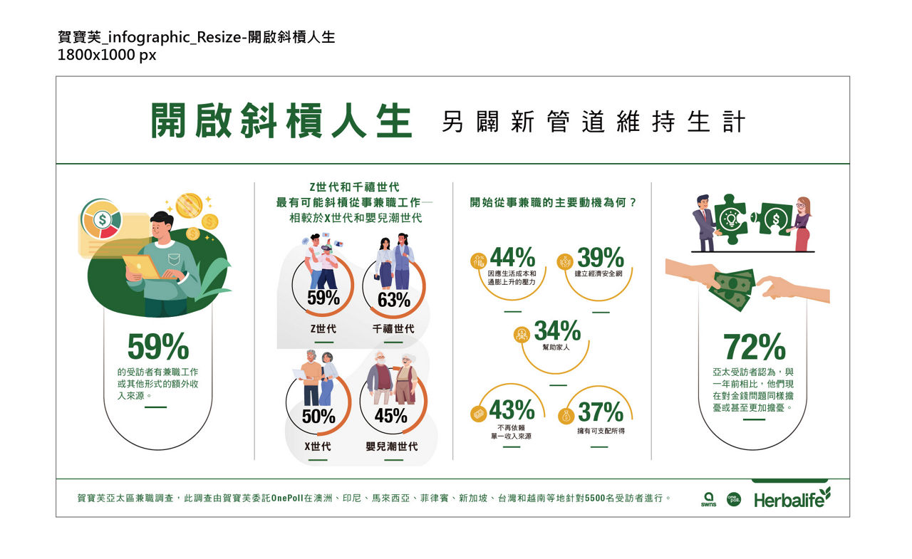 全球知名健康與保健公司賀寶芙發布2023年亞太區兼職調查結果,調查顯示近5分之3(59%)的受訪者有兼職工作,而開始從事兼職工作的主要原因是為了維持生計(61%)。其他開始從事兼職工作的原因包括因應不斷上漲的生活成本(44%),以及不再依賴單一收入來源(43%)。